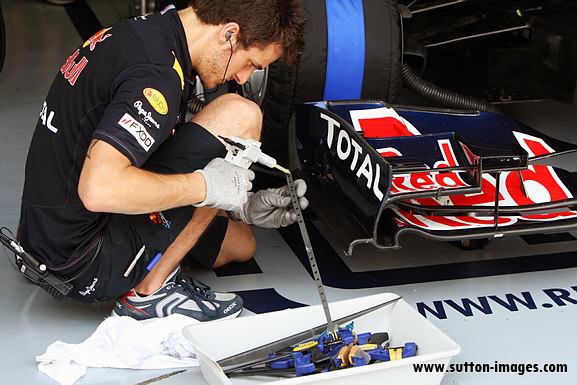 Red-Bull a conseguido superar estas pruebas pero en carrera gracias a que la parte posterior está más alta consiguen que el alerón delantero vaya rozando el suelo. Por eso han colocado unas protecciones en los alerones.